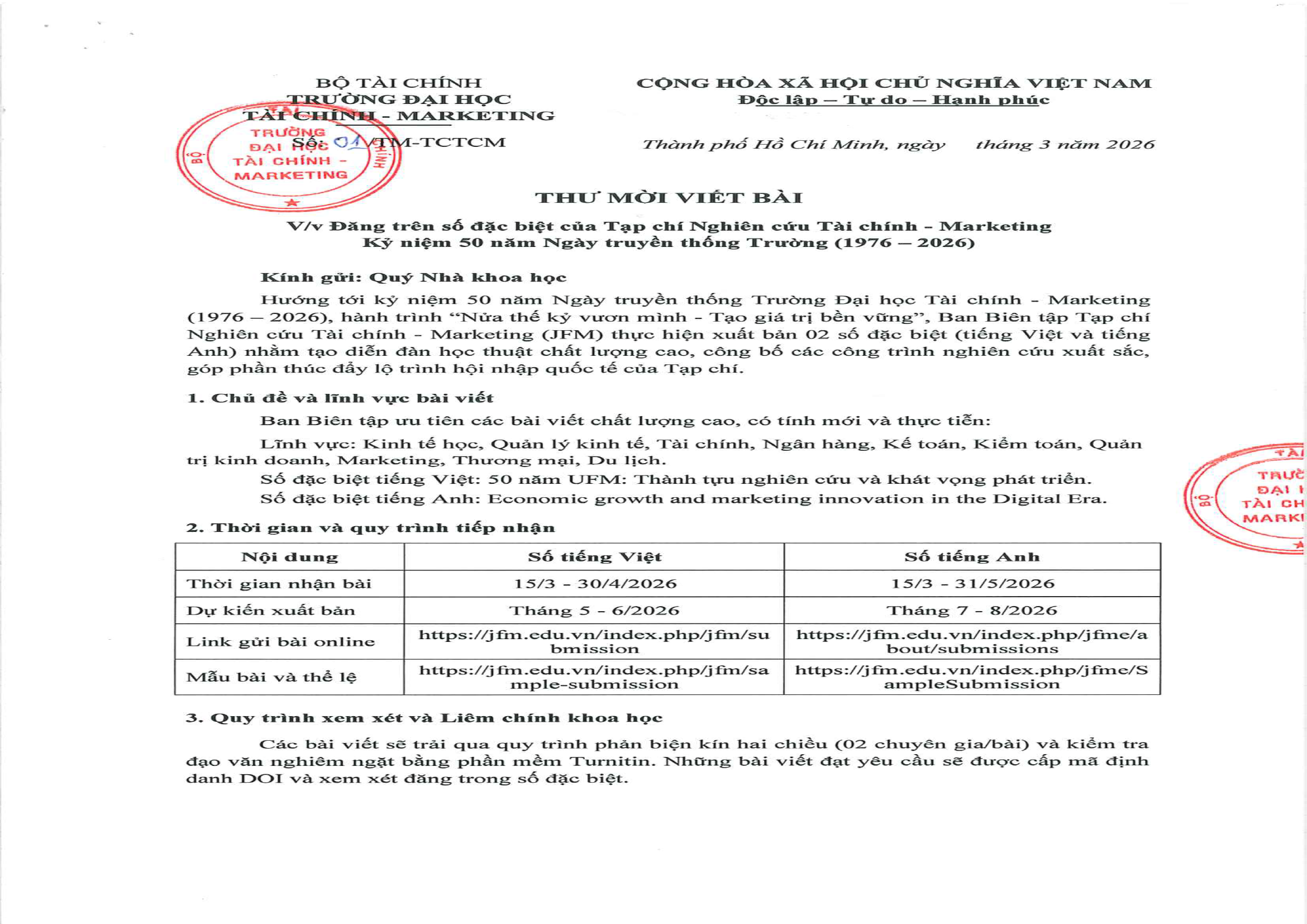 Thư mời viết bài Số đặc biệt kỷ niệm 50 năm Ngày truyền thống Trường Đại học Tài chính - Marketing (1976 - 2026)