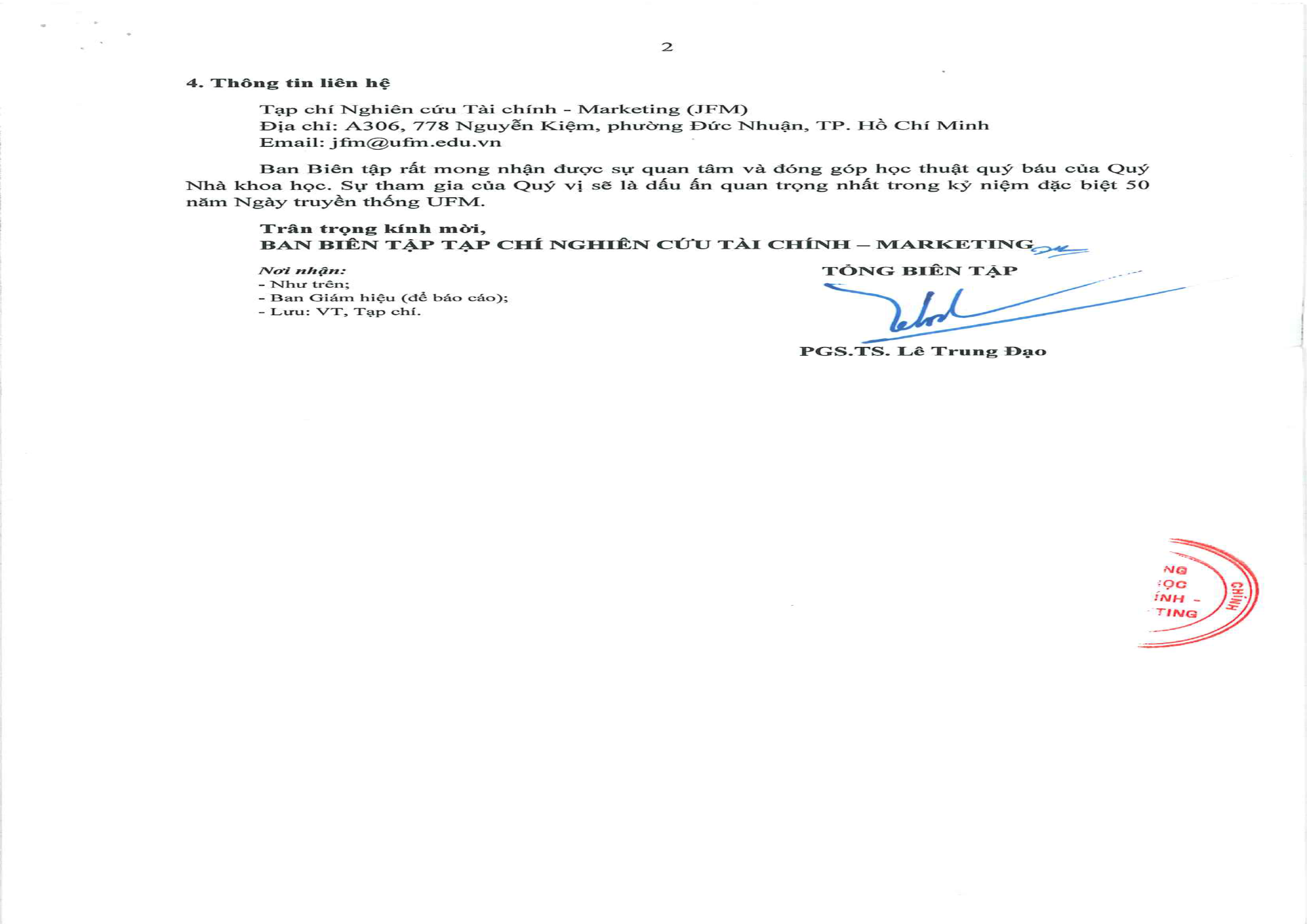 Hướng tới hành trình “Nửa thế kỷ vươn mình - Tạo giá trị bền vững”, Tạp chí Nghiên cứu Tài chính - Marketing (JFM) trân trọng kính mời các Nhà khoa học đóng góp công trình nghiên cứu cho 02 số đặc biệt: