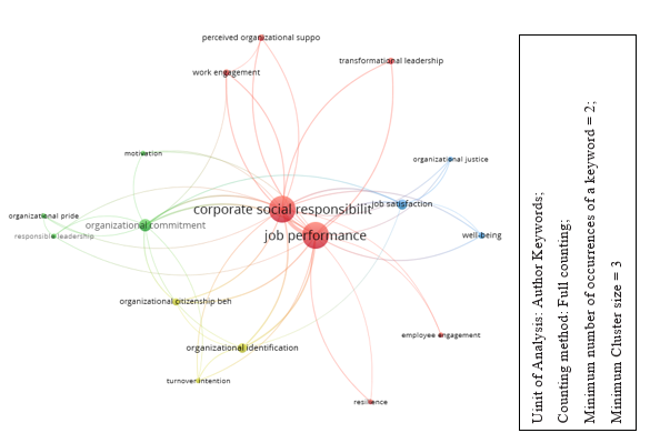 The keywords and journal indexes used by the authors in their articles provide an initial understanding of the research topics within the existing literature (Khanra et al., 2021). Initially, with the minimum keyword occurrence set at five, as suggested by (Van Eck & Waltman, 2014), only seven keywords met the criteria. Subsequently, the threshold was reduced to two in order to explore the range of keywords appearing in studies related to the topic, resulting in 28 keywords reaching the threshold. Next, irrelevant keywords such as employee and customer orientation were removed, as they were not directly related to the research topic or questions. Duplicate or synonymous keywords were also standardized, for instance, internal CSR and CSR were unified under Corporate Social Responsibility, in-role performance, performance, and job performance were replaced by job performance, while affective commitment was replaced by organizational commitment. Finally, VOSviewer identified 17 strongly linked keywords as shown below.