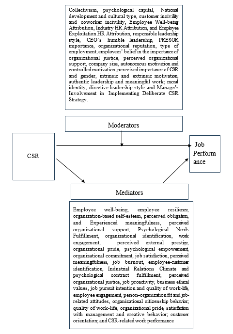 For RQ3 and 4. This study has identified multiple mechanisms explaining how CSR influences job performance, with most studies confirming a positive direct relationship. The mediating factors commonly include organizational identification, job satisfaction, work engagement, and organizational commitment, highlighting the psychological and emotional connection between employees and their organizations. Other mediators such as perceived organizational support, meaningfulness, and employee well-being also play critical roles in translating CSR initiatives into improved job outcomes. In addition, moderating variables such as leadership style, cultural context, psychological capital, and perceived organizational justice significantly shape the strength of this relationship. The findings indicate that both internal psychological processes and contextual factors determine the extent to which CSR enhances job performance. (See Figure 6).